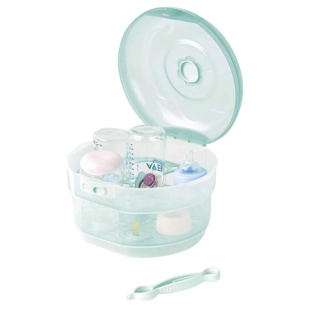 Takes up to six bottles and bottle accessories. Fast, easy and effective steam sterilisation. No additional products necessary. Works in any conventional domestic microwave.
