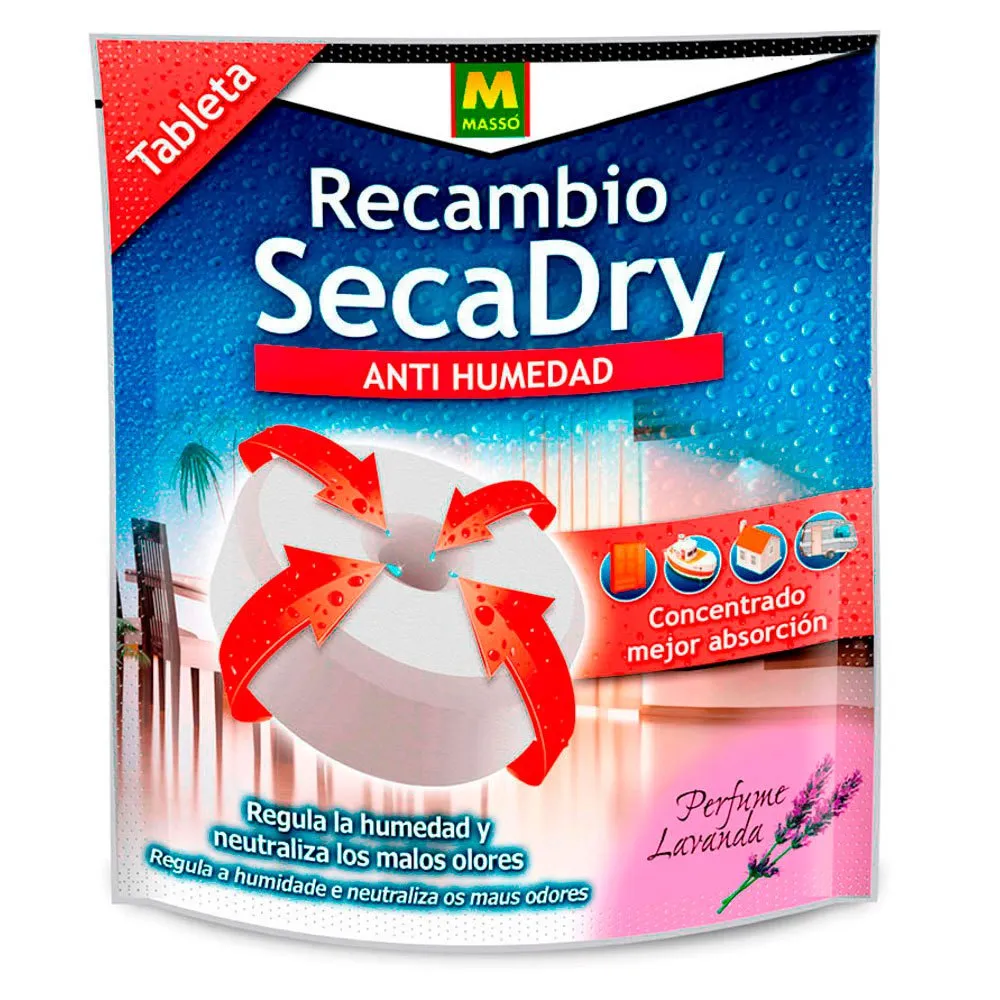 Secadry spare tablet 450 gr. its universal dimensions and design make it usable with most anti-humidity devices. the humidity that has been collected is then spread over the interior cover as a liquid. absorbs and reduces the ambiental humidity until reaching the recommended values (40-60%) without overdrying surrounding air. removes bad smells and provides a nice and soft fragrance of lavanda.